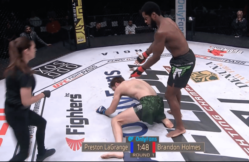 Brandon Holmes otti vakuuttavan voiton Preston LaGrangesta Fury FC 113 -tapahtumassa Houstonissa. Keskisarjan ottelussa nähtiin dramaattinen käänne, kun Holmes tyrmäsi LaGrangen voimakkaalla slamilla, mutta tuomari viivytteli ottelun keskeyttämisessä.