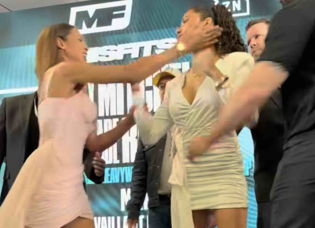 Misfits-mestari Carla Jade ja entinen UFC-ottelija Pearl Gonzalez kohtasivat torstaina räjähdysherkässä lehdistötilaisuudessa ennen lauantain nyrkkeilyotteluaan. Tilanne kärjistyi, kun Jade läimäytti Gonzalezia kasvoihin kiivaassa välienselvittelyssä.
